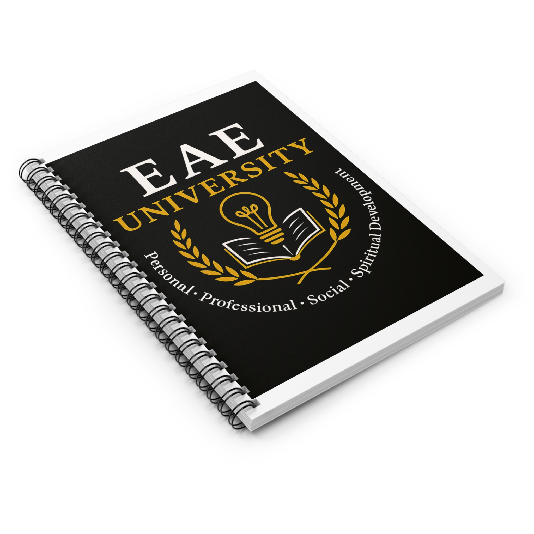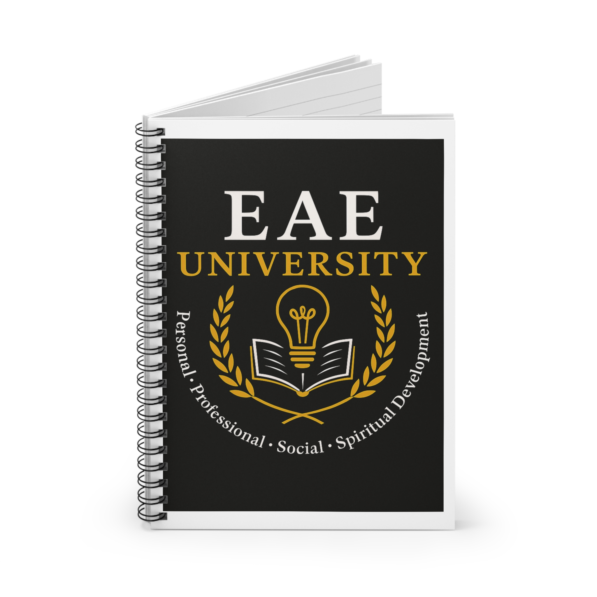 A compact spiral notebook designed for thoughtful note-taking and daily planning. The ruled 118-page interior (90gsm) offers a smooth, sturdy surface for pens and pencils, while the heavy 350gsm covers protect your notes. The front features a bold, scholarly EAE University design in black and gold, giving the notebook a collegiate, aspirational feel. Metal spiral binding lets pages lie flat and makes it simple to remove sheets when you need to share or archive. Inside back cover includes a document pocket to hold loose papers, receipts, or study cards—useful for students, mentors, or anyone building skills and ideas.